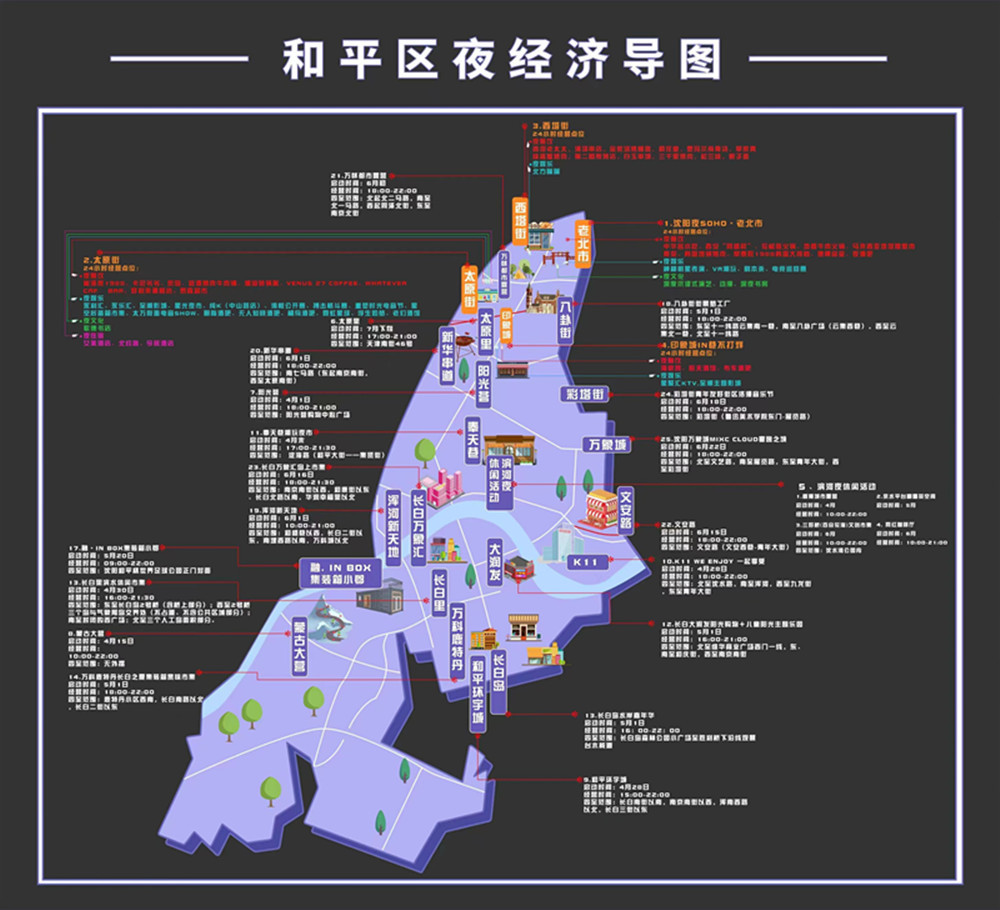 立足“品质和平、人文和平、智慧和平、活力和平”,今年和平区将围绕“夜间经济”+“购物、餐饮、住宿、娱乐、文化、旅游、会展、健康”八大主题,策划举办长白万象汇岛上市集、环宇城口袋公园节、奉天巷潮玩夜市、彩塔街青年友好街区洛漫音乐节等24场夜间经济活动。带动本地人“走出来”,周边人“聚过来”,使城市“亮起来”、经济“活起来”。