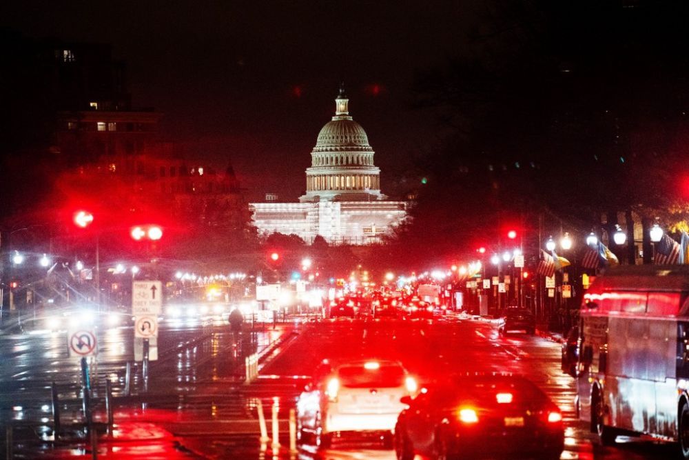 这是2022年12月22日在美国华盛顿拍摄的雨中的车辆和国会大厦。新华社记者刘杰摄