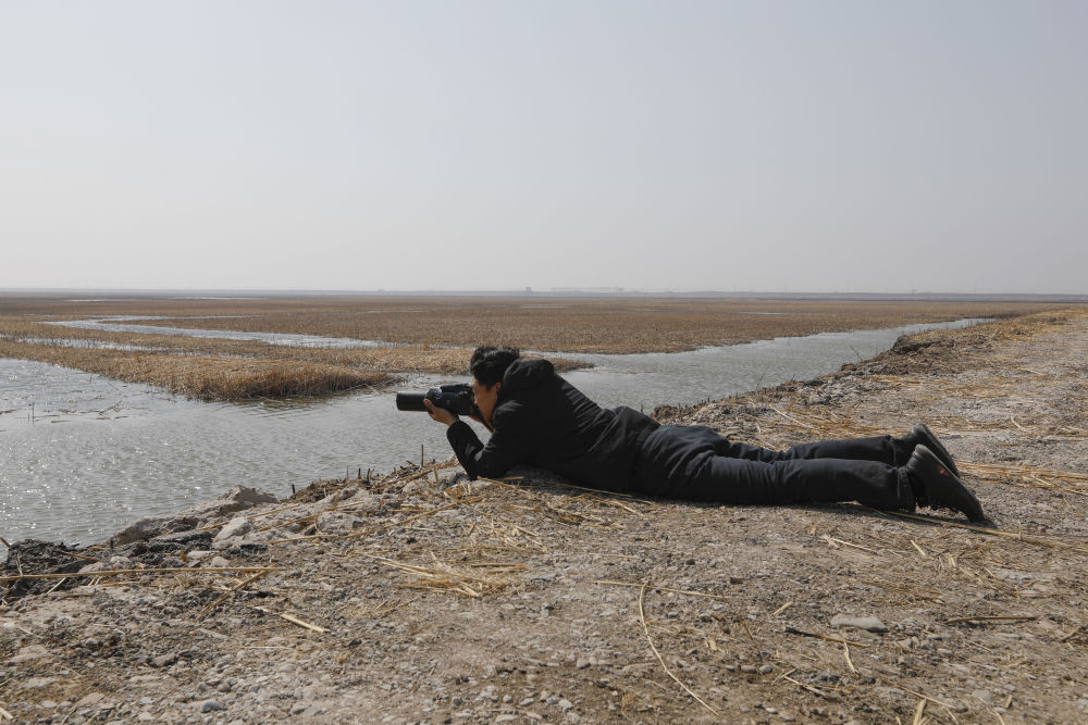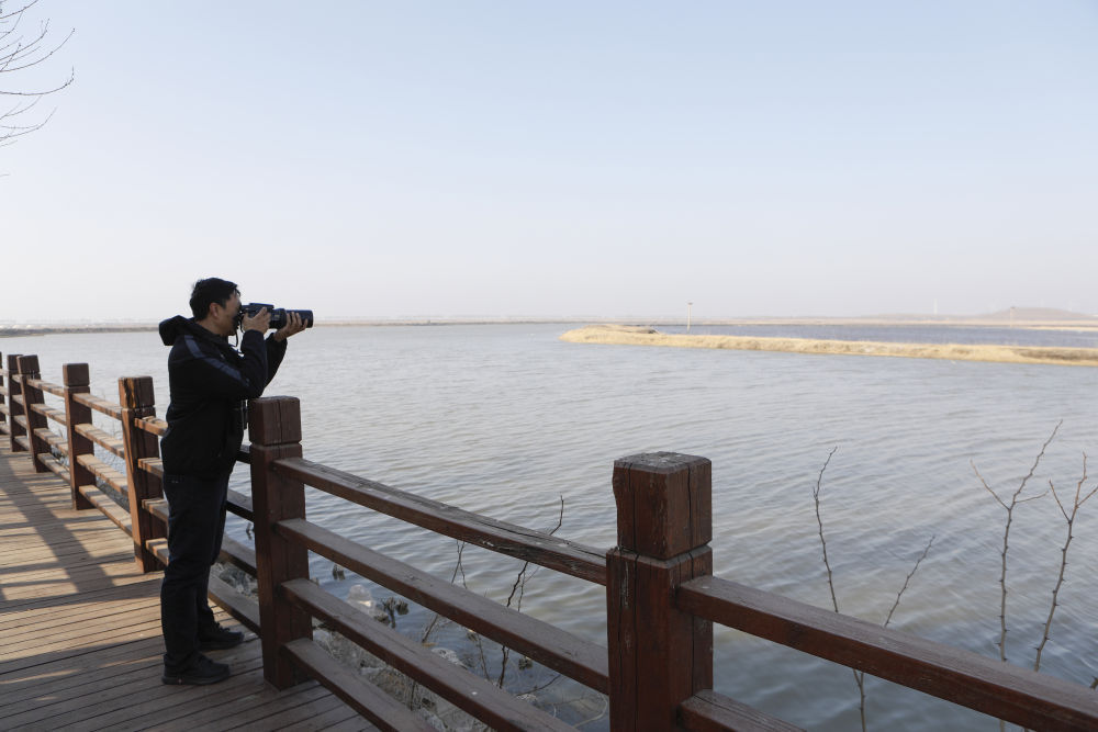 3月28日,余炼在拍摄远处水面上的候鸟。 新华社记者 陈为 摄