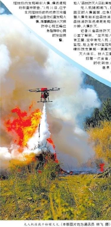 无人机挂载干粉罐灭火。(本版图片均为通讯员 林飞 摄)