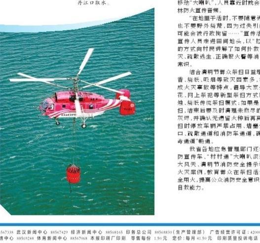 停机场上,一台k-32系列的直升机引起了湖北日报全媒记者注意,据工作人员介绍,这台执行本次巡护任务的“明星”飞机,是一款双发共轴双旋翼无尾桨多用途大型直升机,机身全长11.2米,机身宽度3.8米,旋翼直径15.9米,高5.45米,最大起飞重量12.7吨。今天它的任务是从武当山机场飞向丹江口大坝巡查重点工程区的安全,然后前往武当山古建筑群的森林、文物查看防火情况。