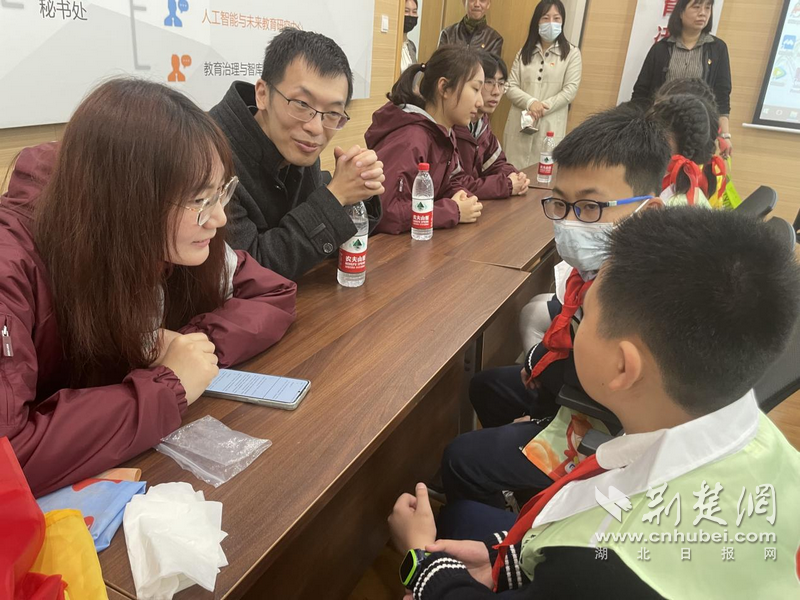 华中师范大学人工智能教育学部讲师万子谦与付家坡小学“新时代小先生”交流。通讯员供图