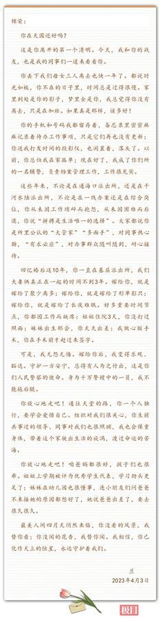 在信中,张兰道尽了自己的无悔。她说,回忆婚后10年,尽管聚少离多,但她无怨无悔。嫁给他后,她变得乐观、豁达。守护一方安宁,总得有人为之付出,这是人民警察的使命。身为千万警嫂中的一员,她不能拖后腿。