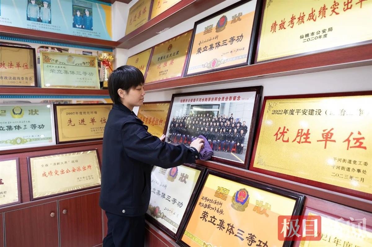 张兰在派出所荣誉室擦拭孔锦荣与战友的合影照