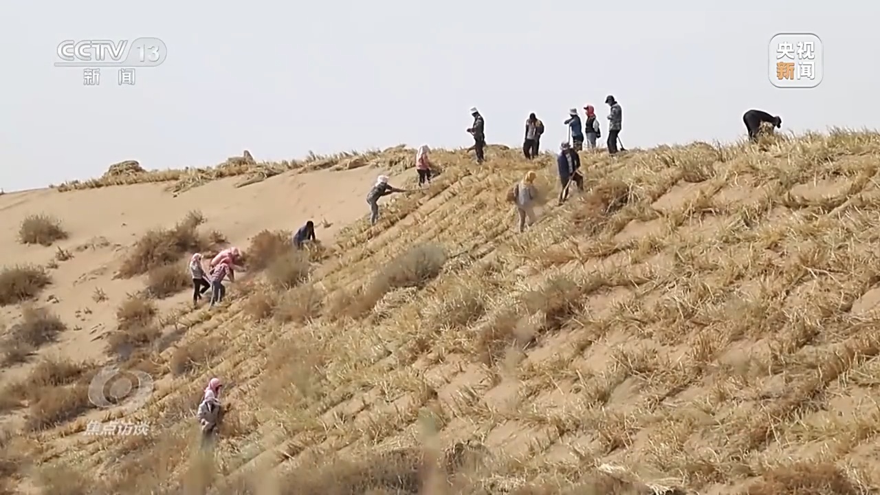 在沙漠上种树,幼苗很容易被吹倒或者被吹走,因此必须先固沙,经过多年实践,草方格成了主要的压沙方式。2019年8月,习近平总书记在甘肃考察时,来到八步沙林场同林场职工们一起干活,当时大家用的就是这种“草方格压沙”的作业方法。