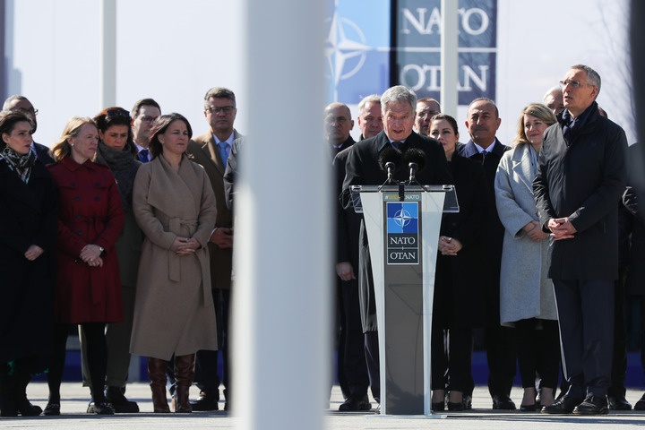 4月4日,在比利时布鲁塞尔的北约总部,芬兰总统尼尼斯托在芬兰加入北约仪式上发言。新华社记者 郑焕松 摄