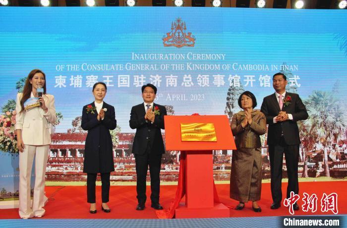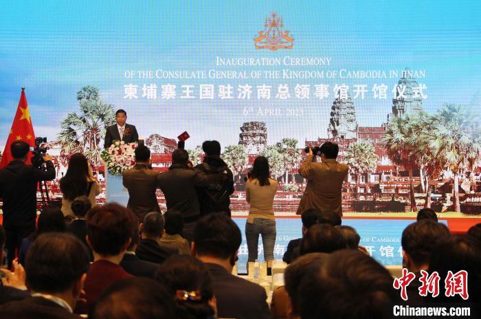 中新网济南4月6日电 (记者 赵晓)柬埔寨王国驻济南总领事馆开馆仪式4月6日在济南举行。该馆为柬埔寨驻中国的第9个总领事馆,将进一步拓展中柬地方间友好交流,推动山东省与柬埔寨在经贸、农业、旅游等领域开展务实合作。