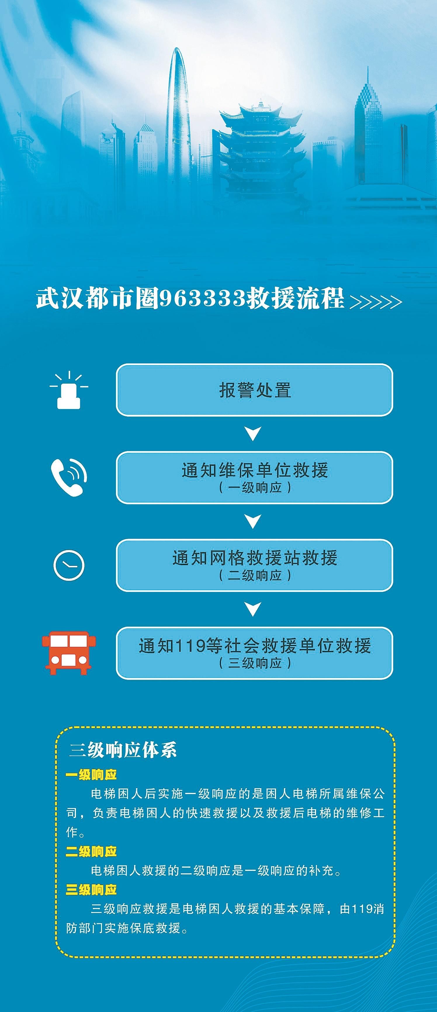 据了解,武汉都市圈电梯应急处置平台以“963333”为电梯救援专用呼叫热线,建立以一级救援为主、二级救援为辅、三级救援为保障的应急救援体系。当电梯发生困人故障时,接警人员首先通知电梯维保单位实施一级救援;维保单位响应不及时,则调度附近网格救援站实施二级救援;网格救援站响应不及时或电梯出现轿厢变形等情形无法正常实施救援,则与119消防指挥中心联动实施三级救援。