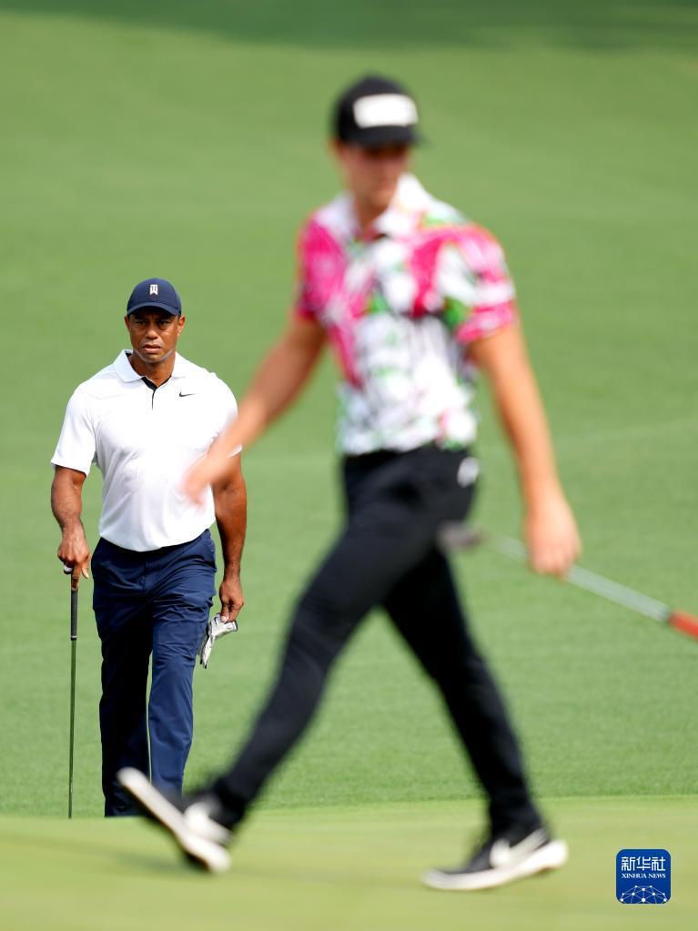 4月6日,美国选手伍兹(左)和挪威选手维克多·霍夫兰在首轮比赛中同组竞技。新华社记者 吴晓凌 摄