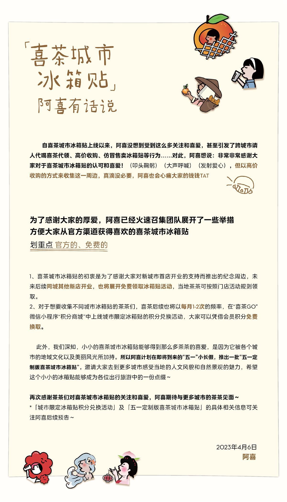 对于请人跨城代喝获取冰箱贴、高价二手倒卖等现象,4月6日喜茶通过官方微博发布回应称:“非常非常感谢大家对于喜茶城市冰箱贴的认可和喜爱,但以高价收购的方式来收集这一周边,真滴没必要”。喜茶还表示,“为了回应大家对喜茶城市冰箱贴的喜爱,阿喜已经火速召集团队展开了一些举措,方便大家从官方渠道获得喜欢的喜茶城市冰箱贴。”
