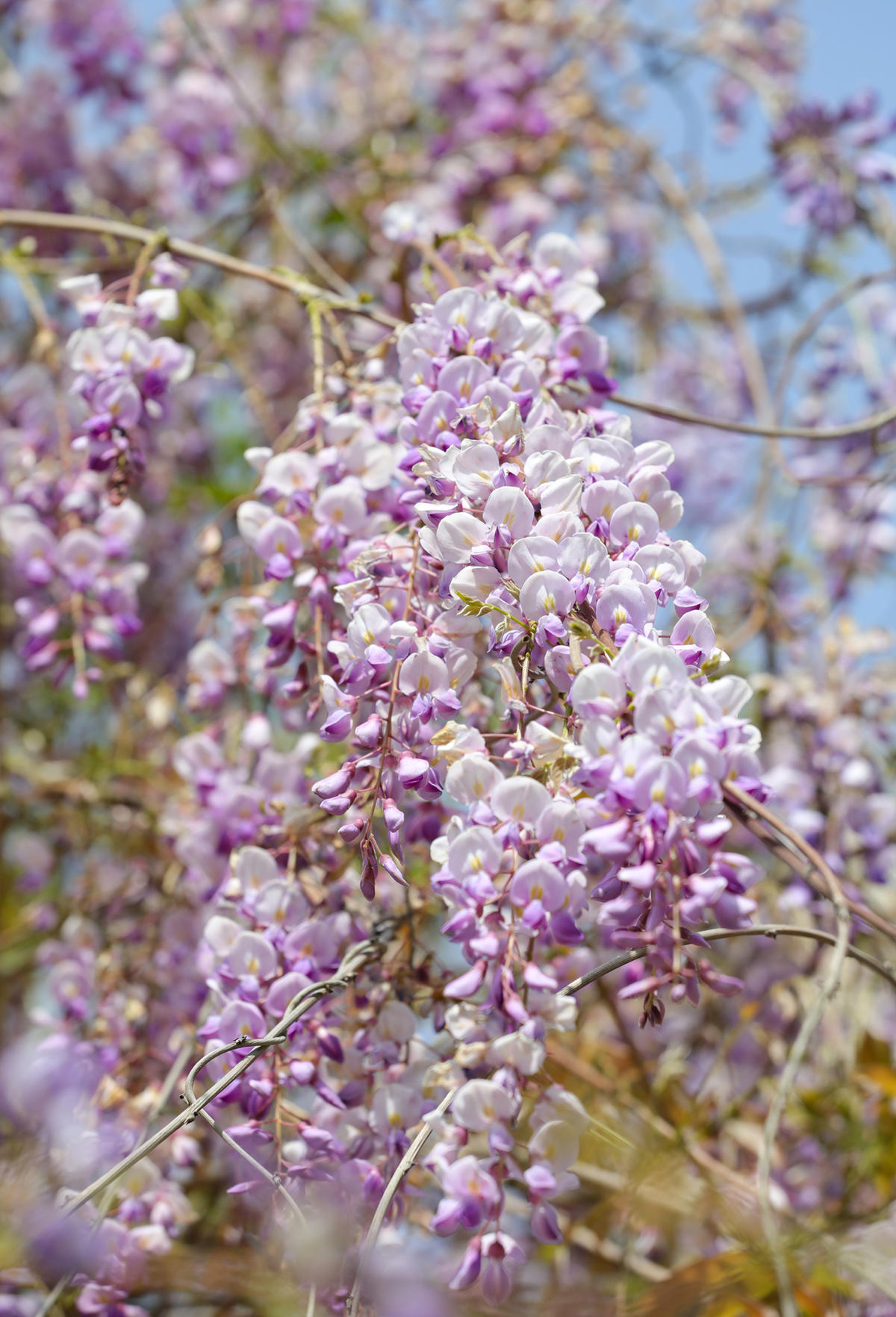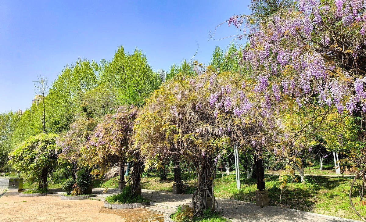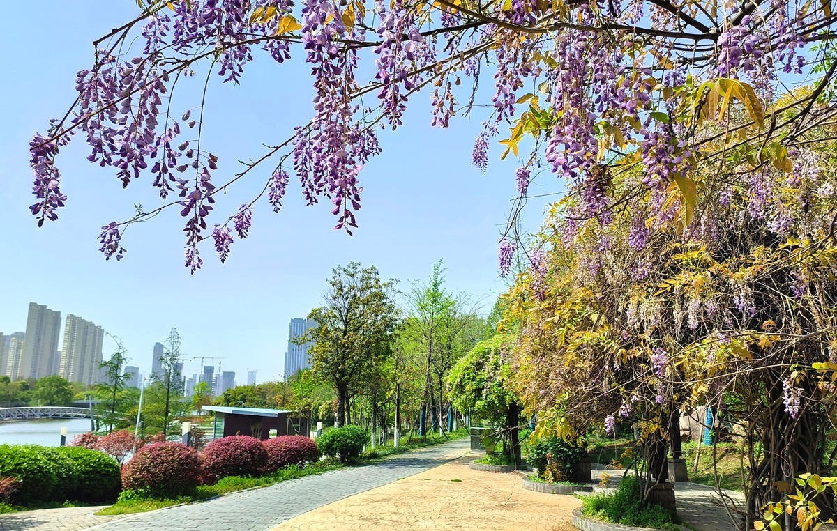 汉阳国博中央水系景观公园内的一处长廊,紫藤树的藤条上垂坠着淡紫色花瀑,随风起舞,飘出阵阵清香,沁人心脾。