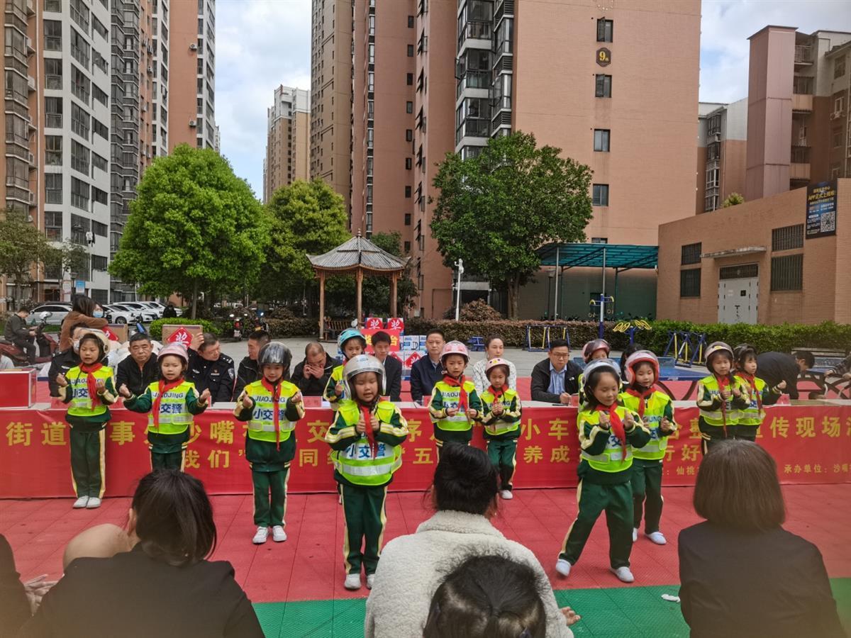 “清晨阳光天空照,妈妈送我去学校,骑车头盔要戴好,防护知识要记牢……”由沔阳小学黄金大道校区14位“小警花”表演的节目《一盔一带、安全常在》,点燃现场气氛,拉开活动序幕。仙桃市交警二大队民警结合交通事故案例,有针对性地用百姓话、平常话向社区居民进行了普法宣传。如何办理牌证、如何正确佩戴头盔等干货知识接连抛出,让现场观众受益匪浅。在场居民争相参与游戏互动,人气爆棚。