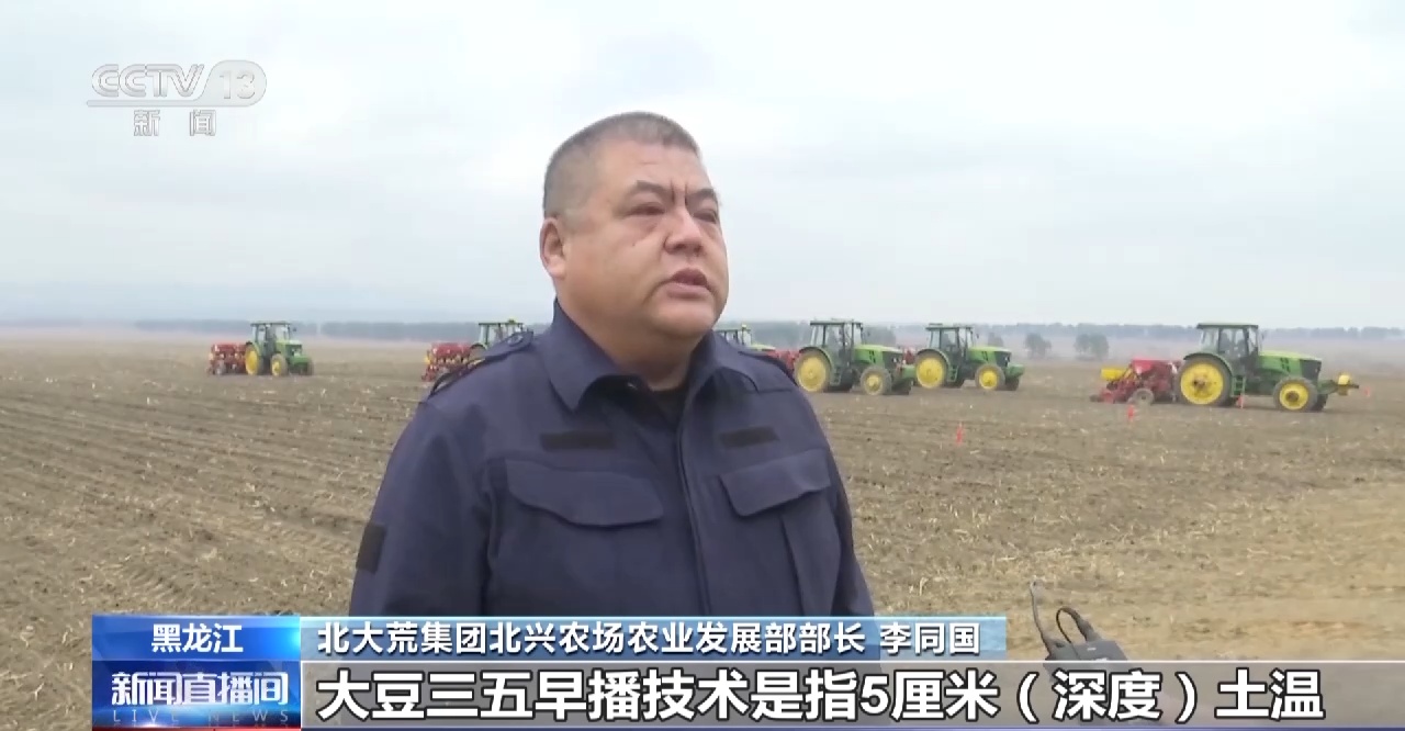 北大荒集团北兴农场农业发展部部长 李同国:大豆三五早播技术是指5厘米深度土温连续五天稳定突破过五度即可进行大豆播种。北兴农场今年的气候条件特别好,再加上去年100%的秋起垄,为大豆早播创造了良好的条件。