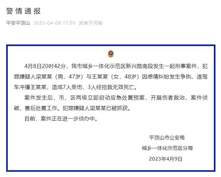 4月8日20时42分,平顶山市城乡一体化示范区新兴路南段发生一起刑事案件,犯罪嫌疑人梁某某(男,47岁)与王某某(女,48岁)因感情纠纷发生争执,遂驾车冲撞王某某,造成7人受伤、3人经抢救无效死亡。