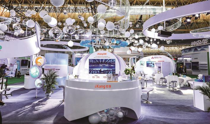 基因之形、健康之色、医疗之云。4月8日,健博会现场,沉浸感十足的爱康展区让人仿若置身于未来健康世界。