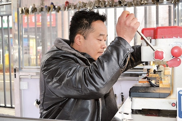 在关东街天龙路路口,便民服务点有两位师傅入驻,69岁的甘师傅专门补鞋,李师傅的专长则是配钥匙和修自行车。
