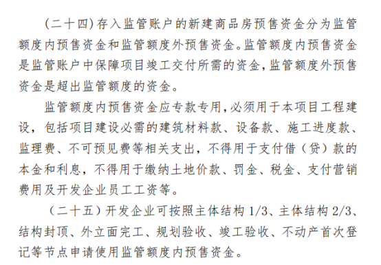 监管额度内预售资金应专款专用,必须用于本项目工程建设,包括项目建设必需的建筑材料款、设备款、施工进度款、监理费、不可预见费等相关支出,不得用于支付借(贷)款的本金和利息,不得用于缴纳土地价款、罚金、税金、支付营销费用及开发企业员工工资等。