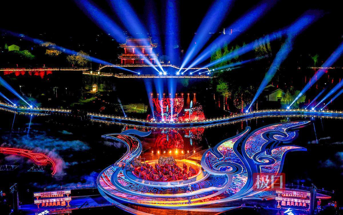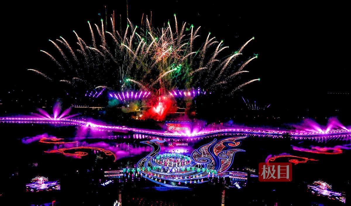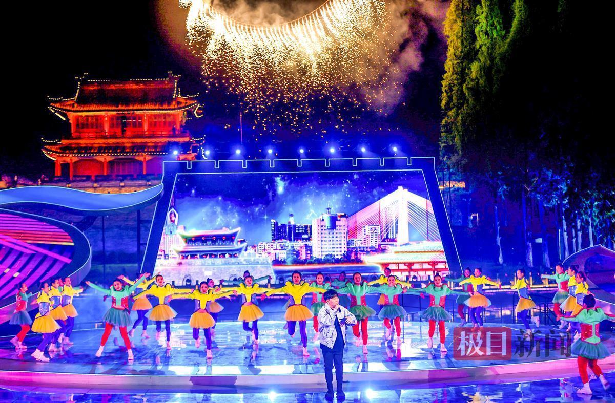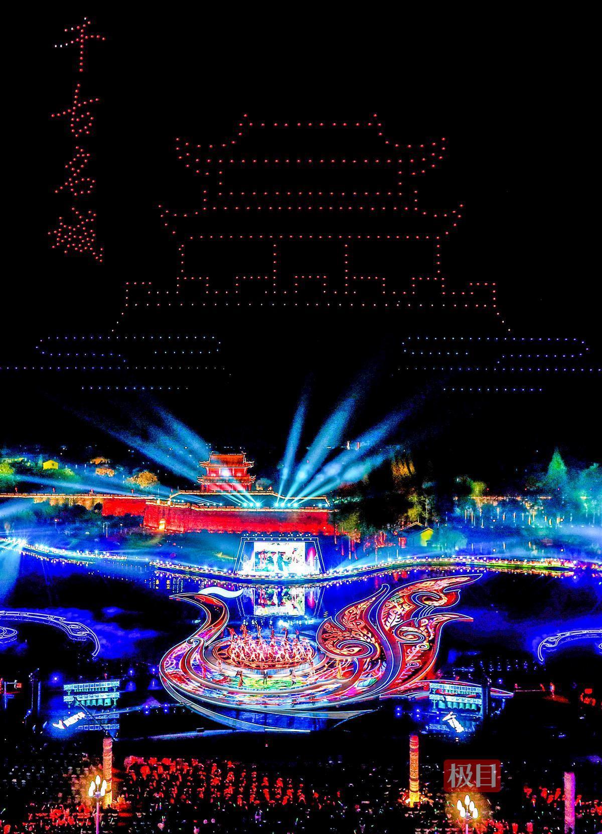 当晚,夜幕下的荆州古城护城河面,以楚凤为造型元素的水上舞台光影绚烂、美轮美奂。夜空、古城墙、护城河、楚凤舞台组成一个视觉整体,绘成一幅梦幻瑰丽、浪漫唯美的画卷。