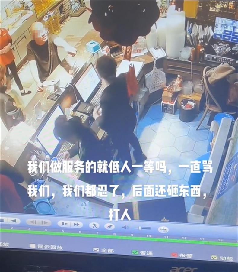 多段网络视频显示,一名光头男子在一家餐馆收银台和收银员及一名服务员沟通之后,拿起台面上的东西砸了出去,收银员连忙躲闪。之后,男子又打翻了饮水机上的水桶。期间,男子在店内多次砸东西,还猛地踹了一名女服务员。被踹服务员在地上坐了好一会,才被同事扶起来,当场哭了起来。