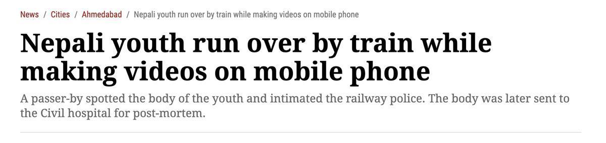 据《印度快报》报道,当地时间4月12日,一名尼泊尔青年在印度古吉拉特邦苏拉特的萨钦火车站附近拍摄视频时,被火车碾压身亡。