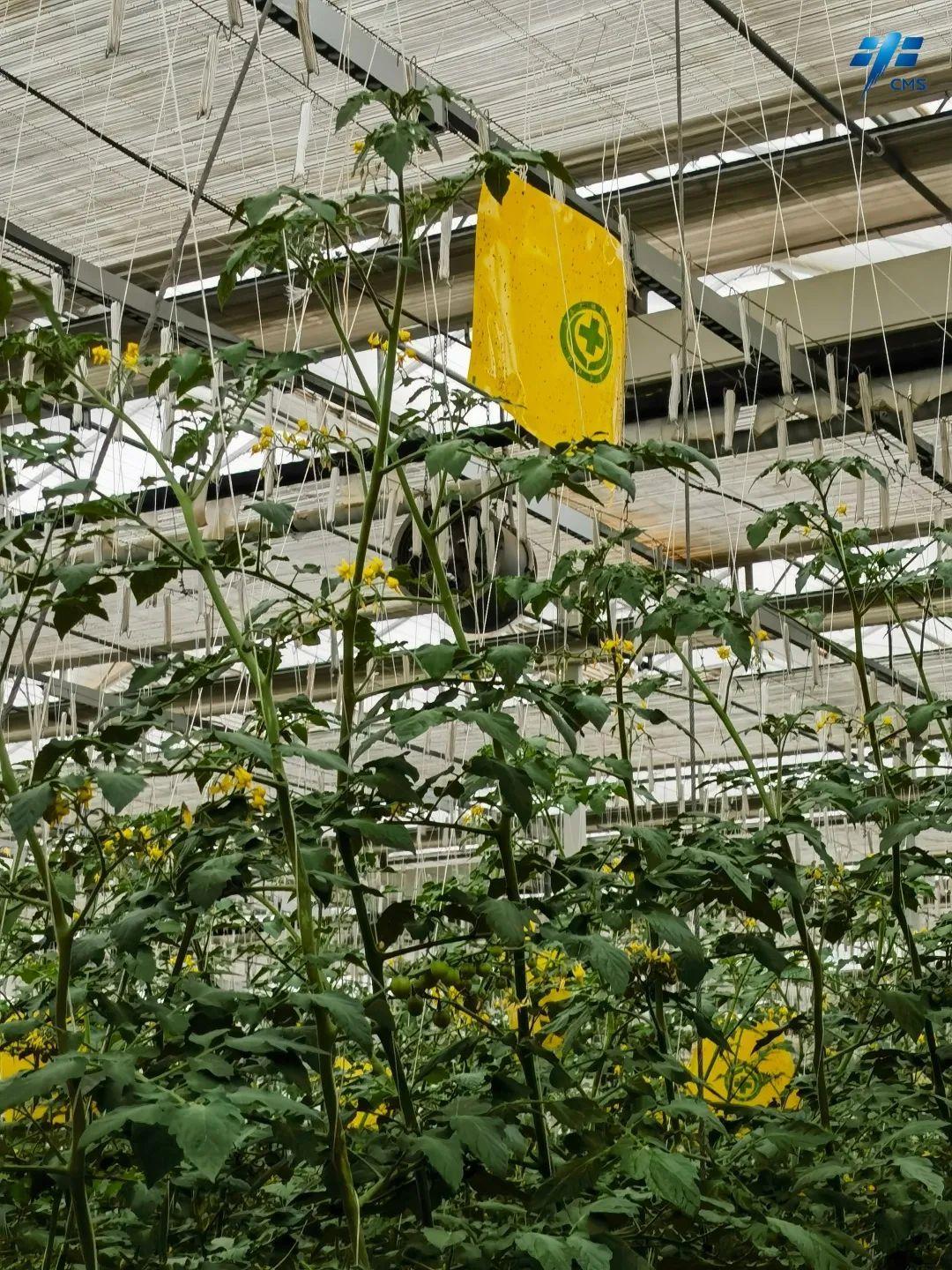 在半封闭智能温室里,悬挂了一些黄色的粘虫板,利用蚊虫对黄色的趋光性,粘贴蚊虫,减少虫害对植物的影响,同时减少化学农药的使用,为植物提供更好的生长环境。