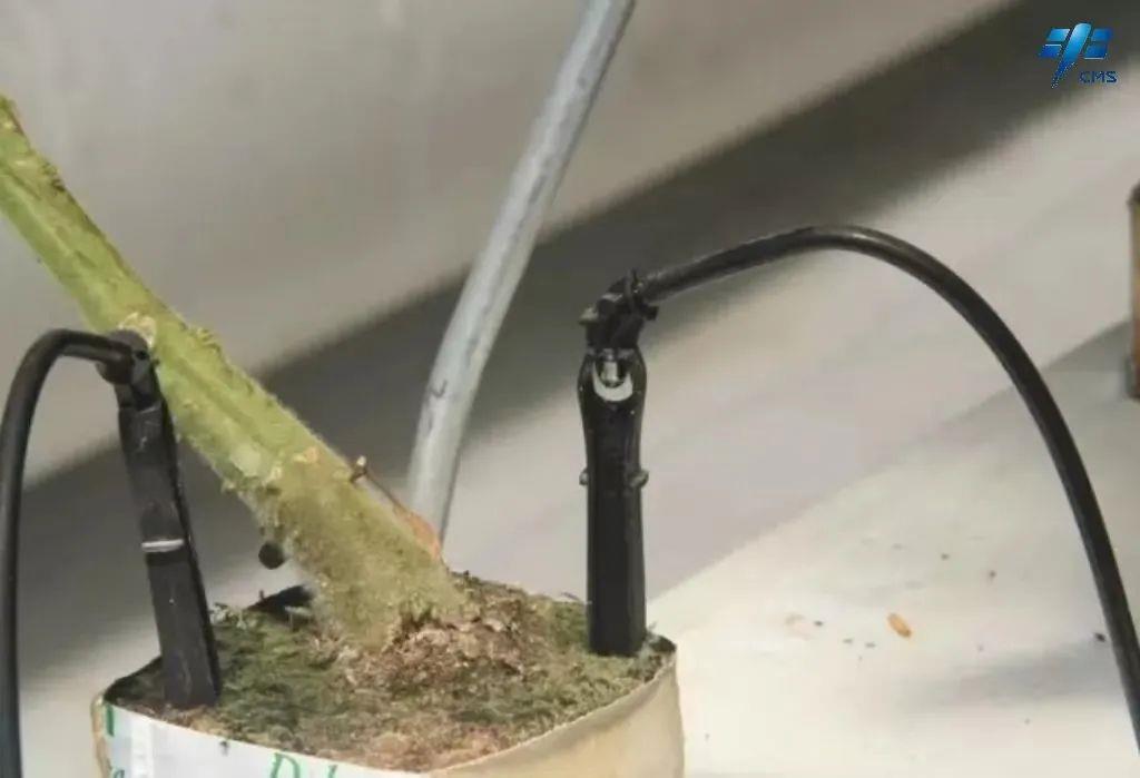 既然是无土栽培,那么如何提供植物生长所需要的养分呢?在半封闭智能温室里,植株以椰糠作为基质,采用无土栽培技术进行吊挂式栽培。在基质中插入二箭头滴箭灌溉,水肥可控,精确灌溉,滴量均匀,有利于提高作物品质和产量。各种养分检测探头与自动控制装置结合,调控营养液的适宜温度、元素配比、溶氧量、pH值(氢离子浓度指数)等,以保证植物的快速生长。