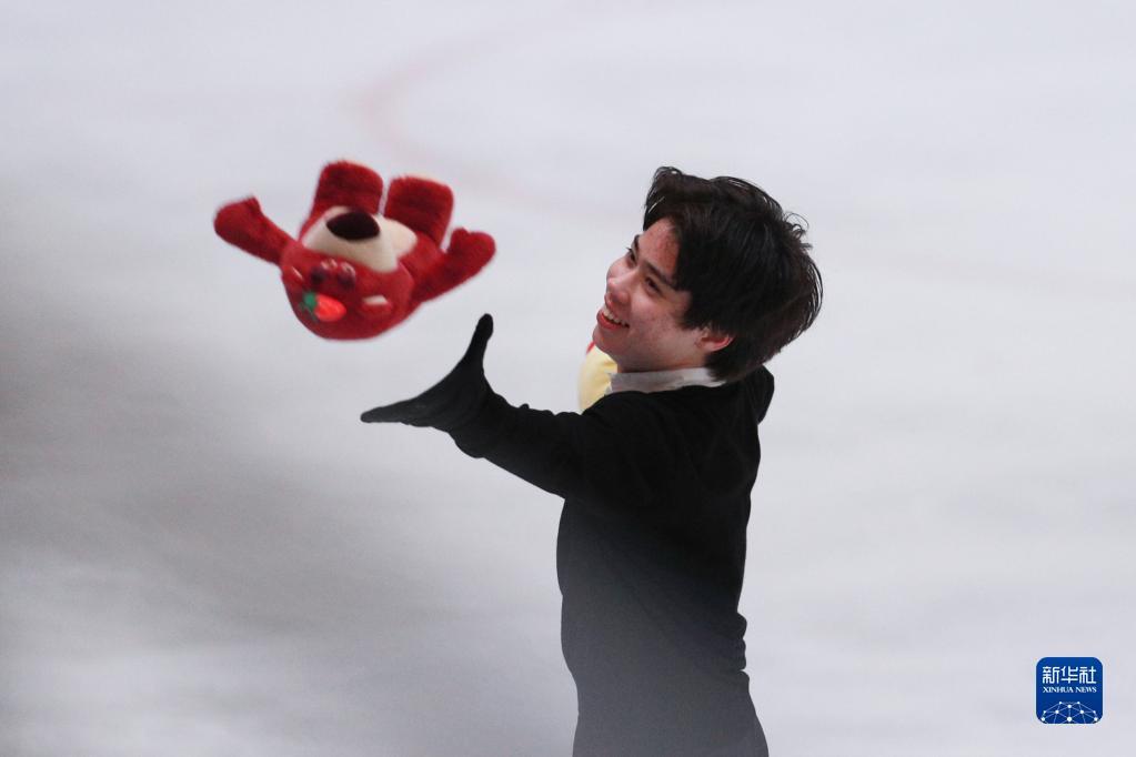 4月13日,戴大卫在男子单人滑自由滑比赛后接住观众扔向场内的毛绒玩具。新华社记者 许雅楠 摄