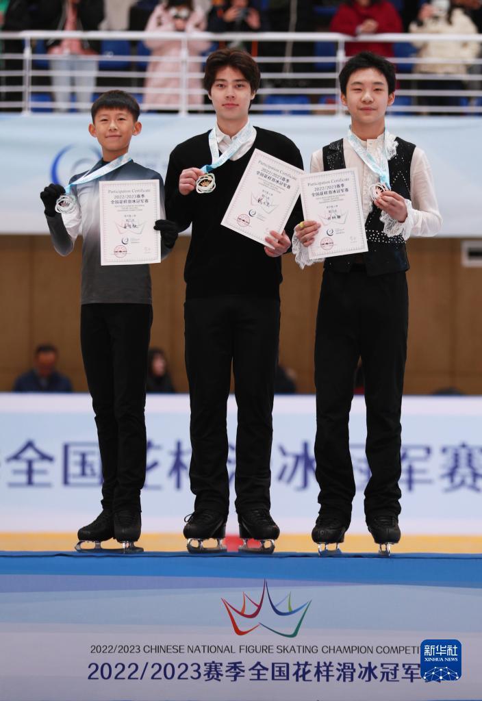 4月13日,冠军广东省体育局选手戴大卫(中)、亚军黑龙江省冰上训练中心选手姜智敖(左)和季军吉林省体育局冰上运动管理中心选手田桐赫在男子单人滑颁奖仪式上。新华社记者 许雅楠 摄