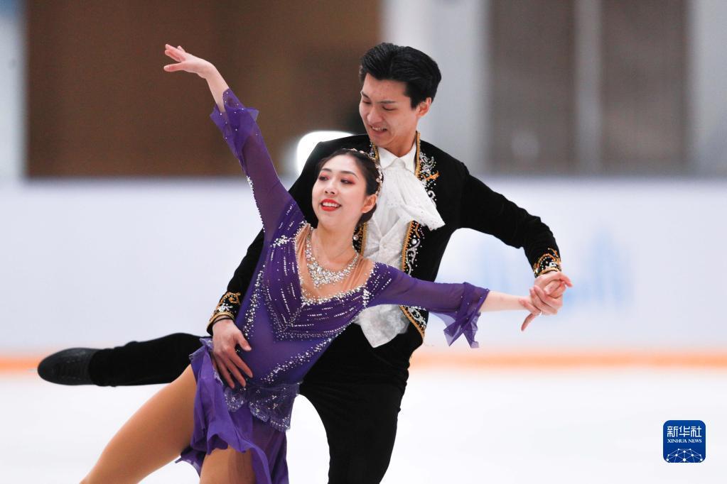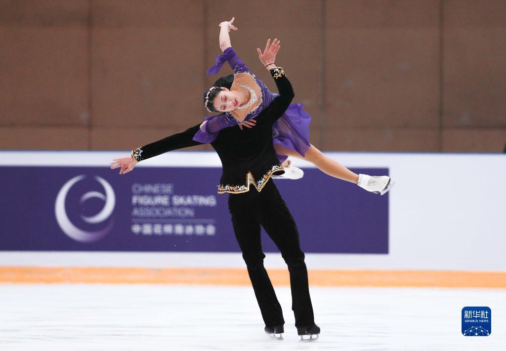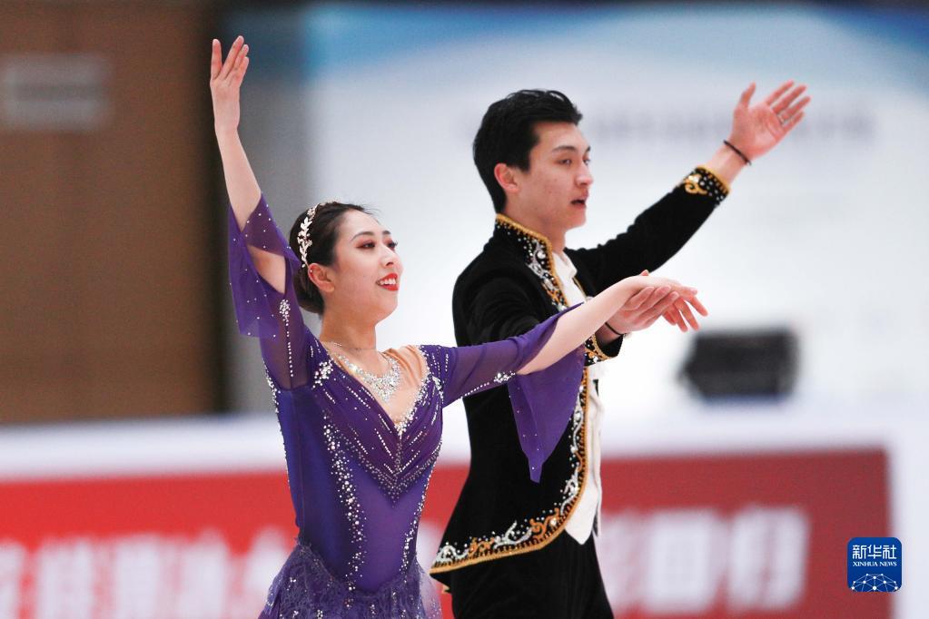 4月13日,哈尔滨市冬季运动项目训练中心选手陈溪梓(右)/邢珈宁在冰舞自由舞比赛中。新华社记者 许雅楠 摄