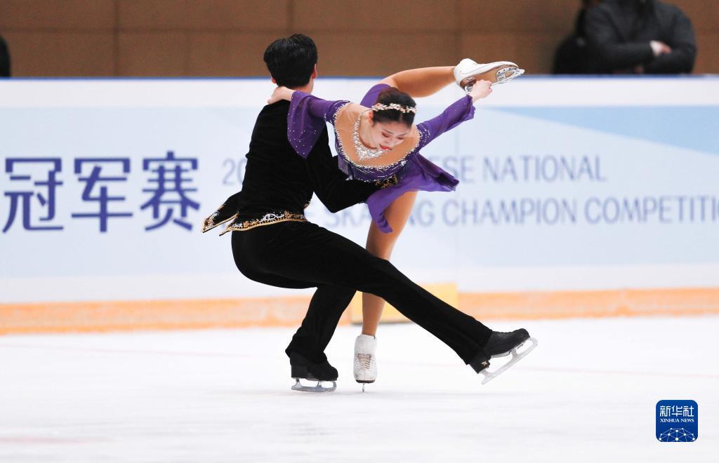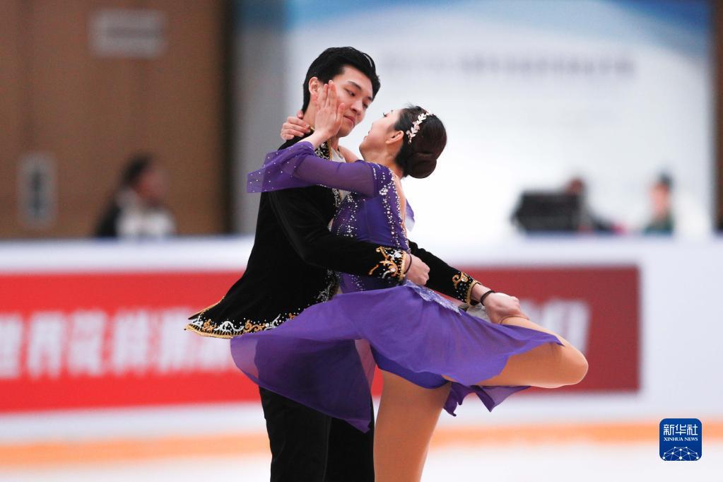 4月13日,哈尔滨市冬季运动项目训练中心选手陈溪梓(前)/邢珈宁在冰舞自由舞比赛中。新华社记者 许雅楠 摄