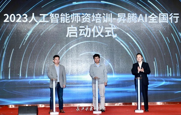 武汉理工大学副校长刘春江、信息技术新工科产学研联盟副秘书长计卫星、昇腾生态发展部副部长张存燕共同启动“2023人工智能师资培训AI全国行”仪式