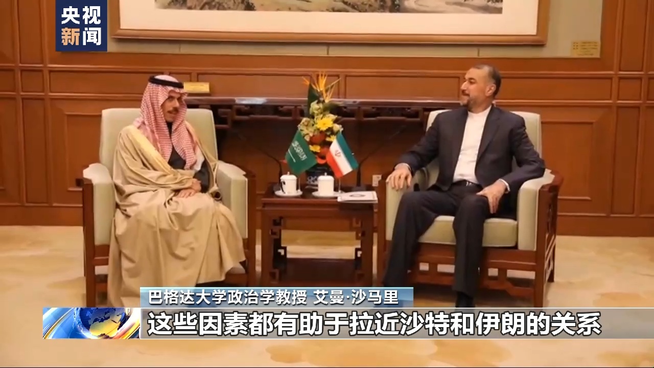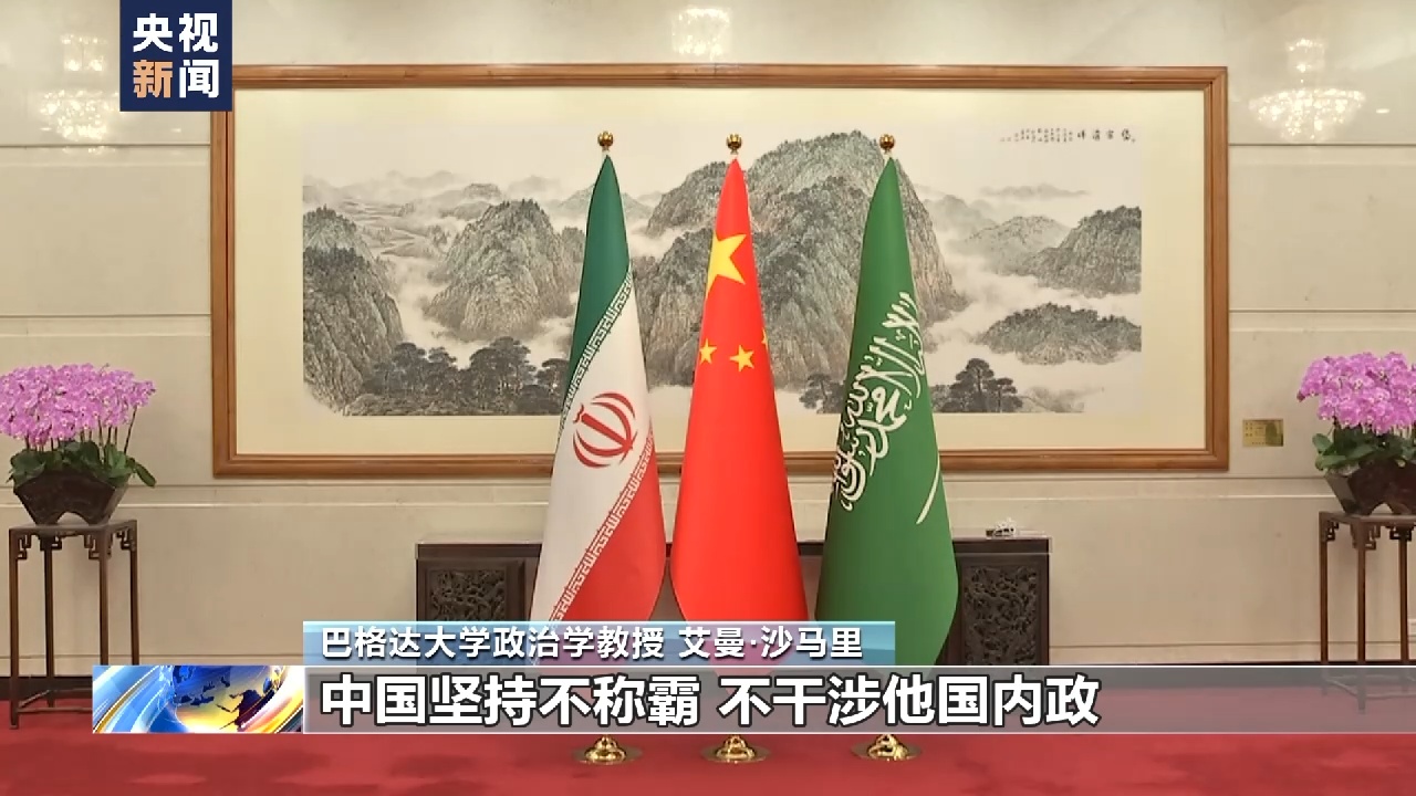 巴格达大学政治学教授 艾曼·沙马里:中国致力于在国际体系中建立良好外交关系,中国坚持不称霸、不干涉他国内政,也致力于同各国共享利益和发展成果,这些因素都有助于拉近沙特和伊朗的关系。事实证明,中国在外交领域具备化解国际争端的能力,开辟了解决国际问题的新视野,我认为这一点是国际公认的。