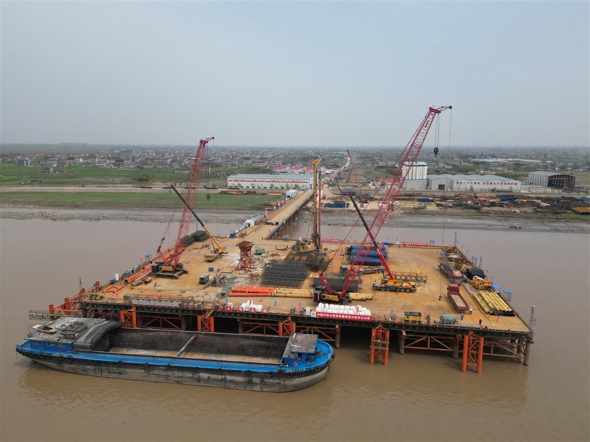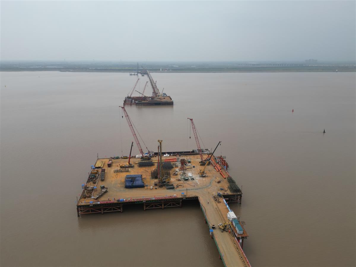 从岛上放眼望去,宽阔的江面奔腾向东,1.5公里的栈桥徐徐铺展,伸入江心。两侧主塔施工平台上,履带吊机、汽车吊机伸出20多米的长臂,起吊钢护筒等装备,400多名工人有序展开焊接、安装等。
