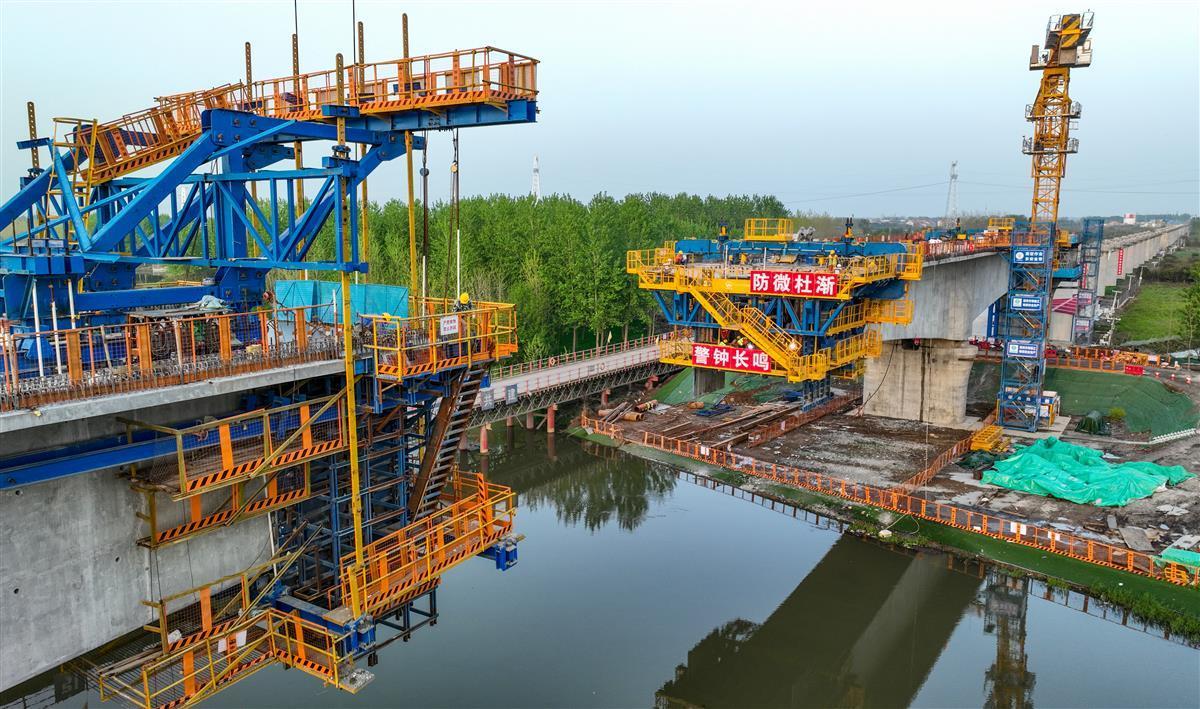 在2标汉川市民乐渠,为了减少施工对水渠的影响,设计要求“一跨过渠”。为此,中铁四局的建设者自主研制出悬臂智慧造桥机进行连续梁施工,能够在远距离墩身之间,横挂空中,像“春蚕吐丝”一样造桥,自动走行、调模、喷淋等,避免了直接在水渠中打桩、架梁。