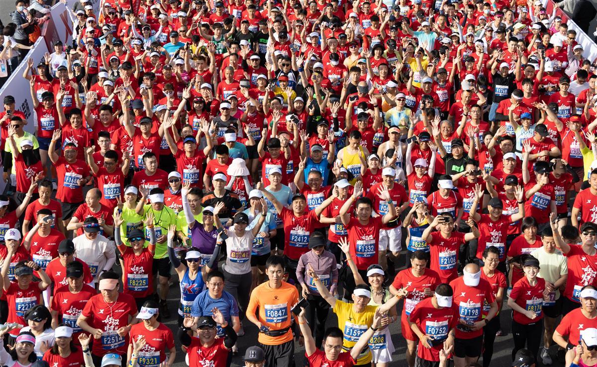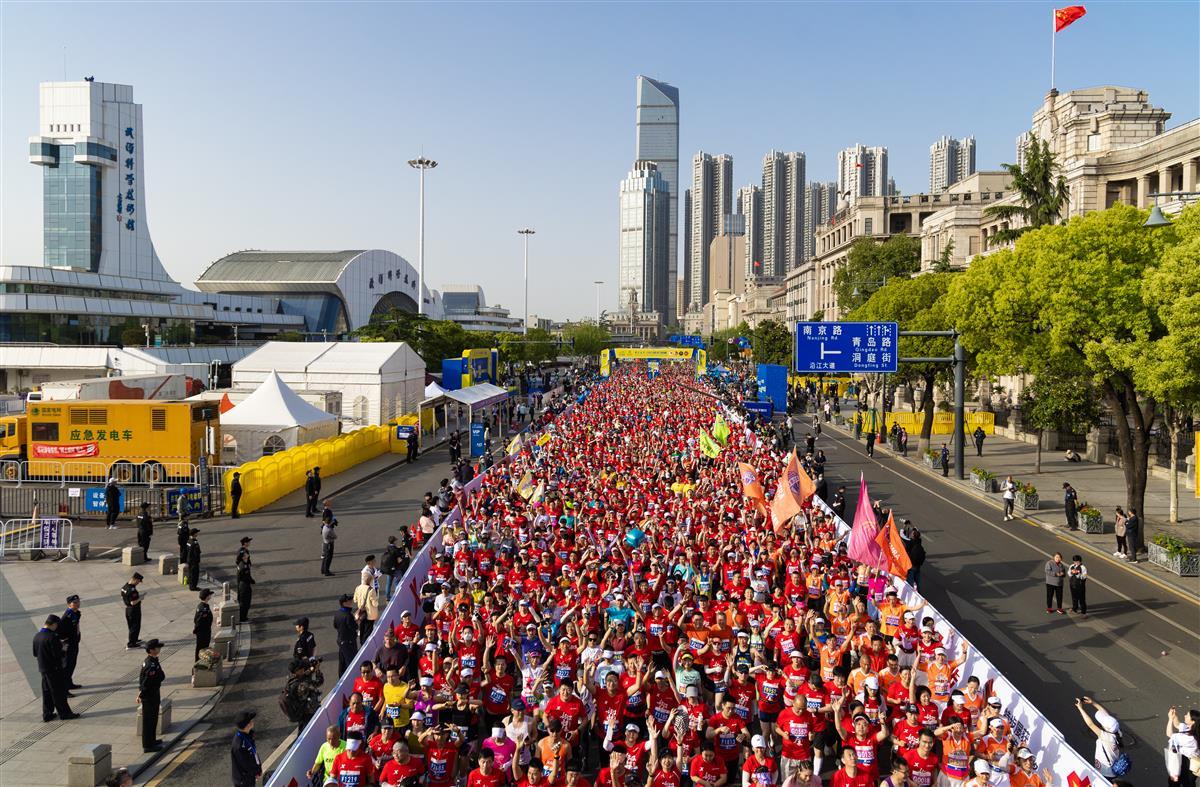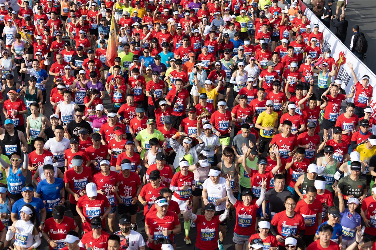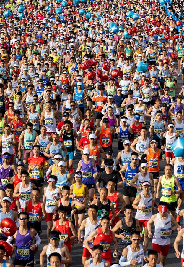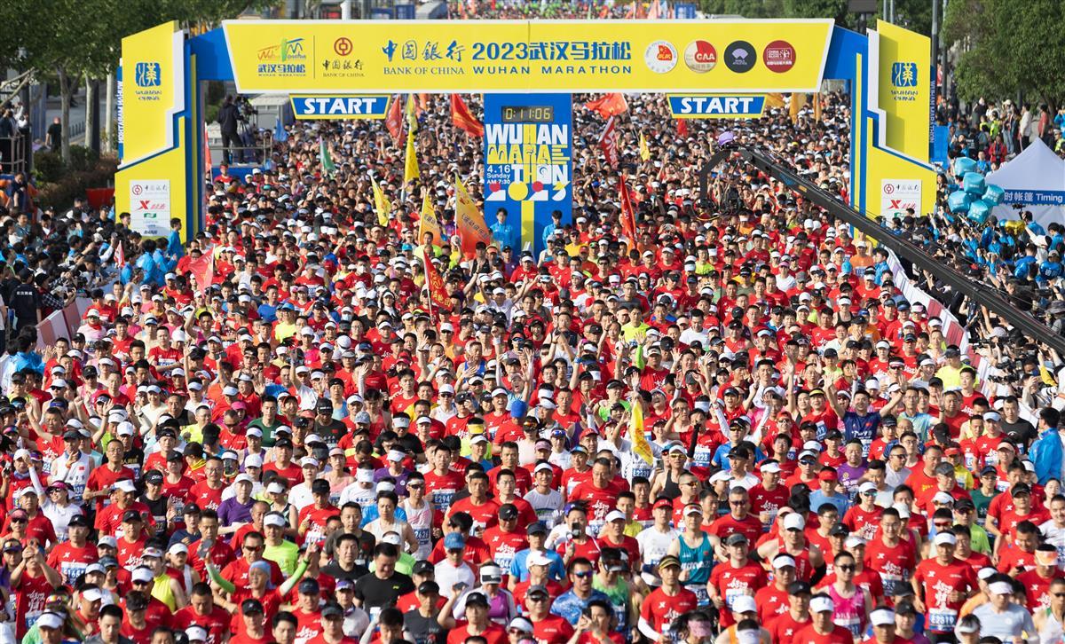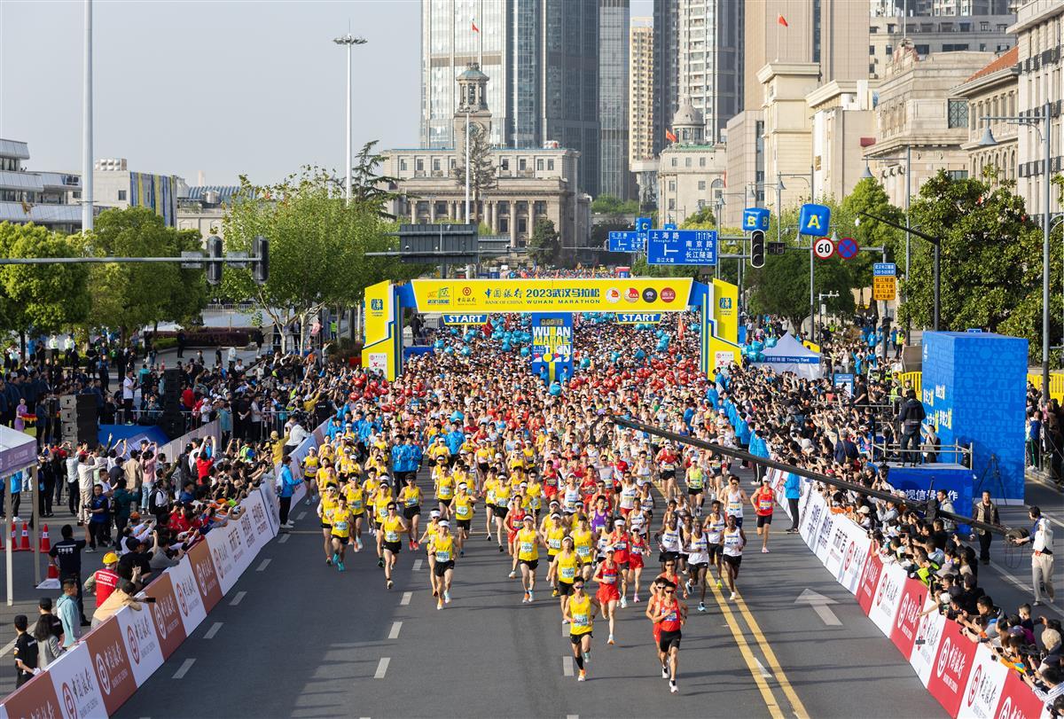4月16日7时30分,2023武汉马拉松在汉口江滩开跑。2023武汉马拉松有2.6万名选手参赛,其中全程马拉松8000人,半程马拉松10000人,13公里跑8000人。(湖北日报全媒记者柯皓摄)