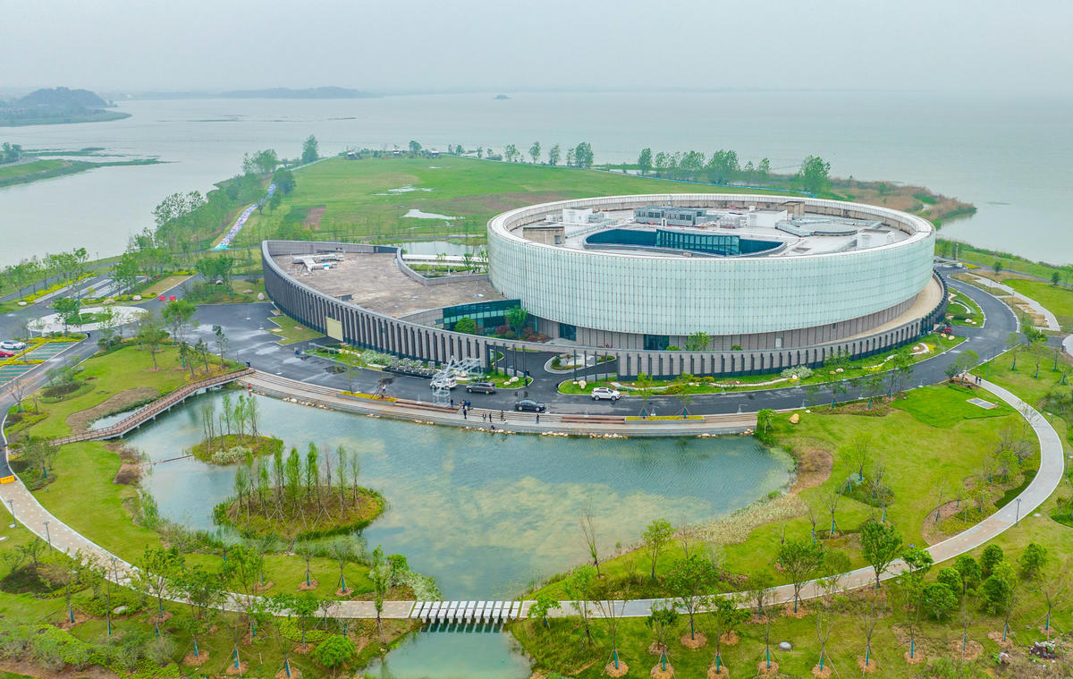 4月13日,鸟瞰梁子湖生态文明馆。该馆是华中地区首个以湖泊保护、水生态修复、水生物多样性保护为特色的研究展示中心。 (湖北日报全媒记者 薛婷 摄)