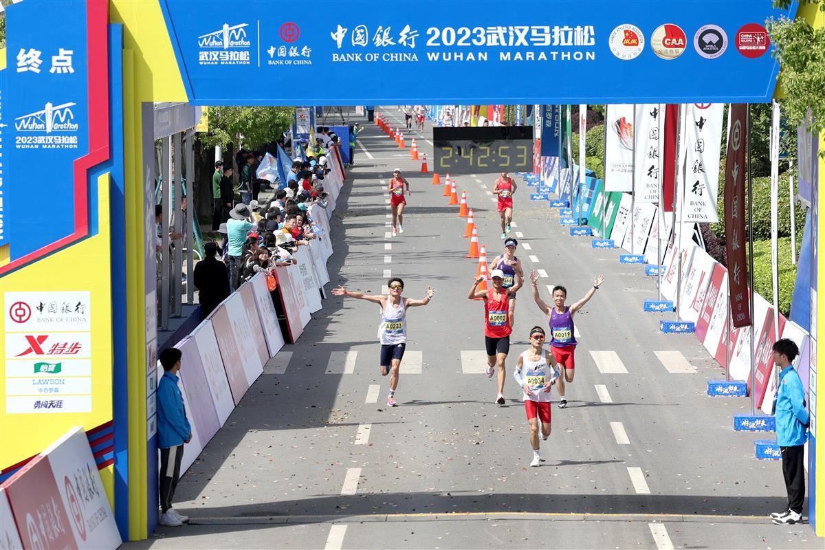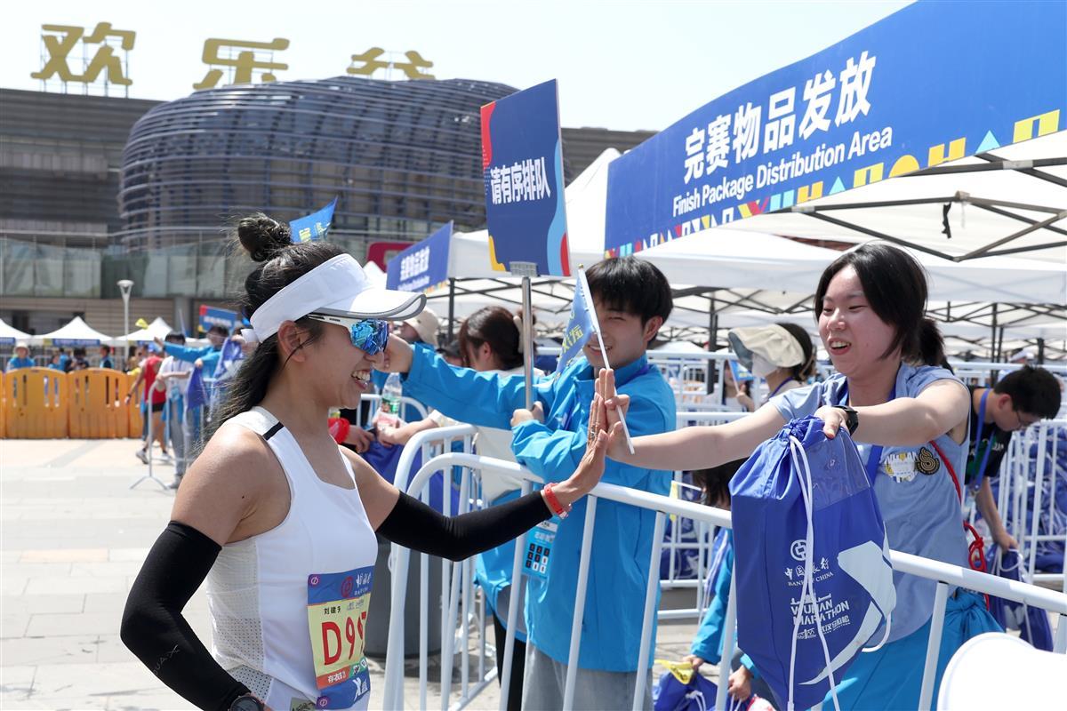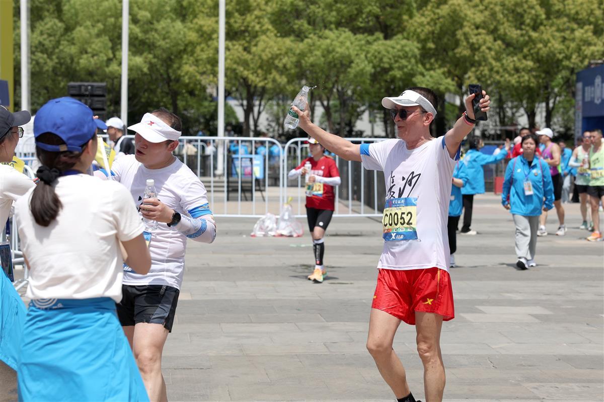 2023年4月16日,在武汉欢乐谷“汉马”终点现场,参赛选手挥舞手臂冲过终点,圆满完成比赛。2023武汉马拉松鸣枪起跑,26000人参加了全马、半马、13公里跑等项目的争夺。(湖北日报全媒记者倪娜摄)