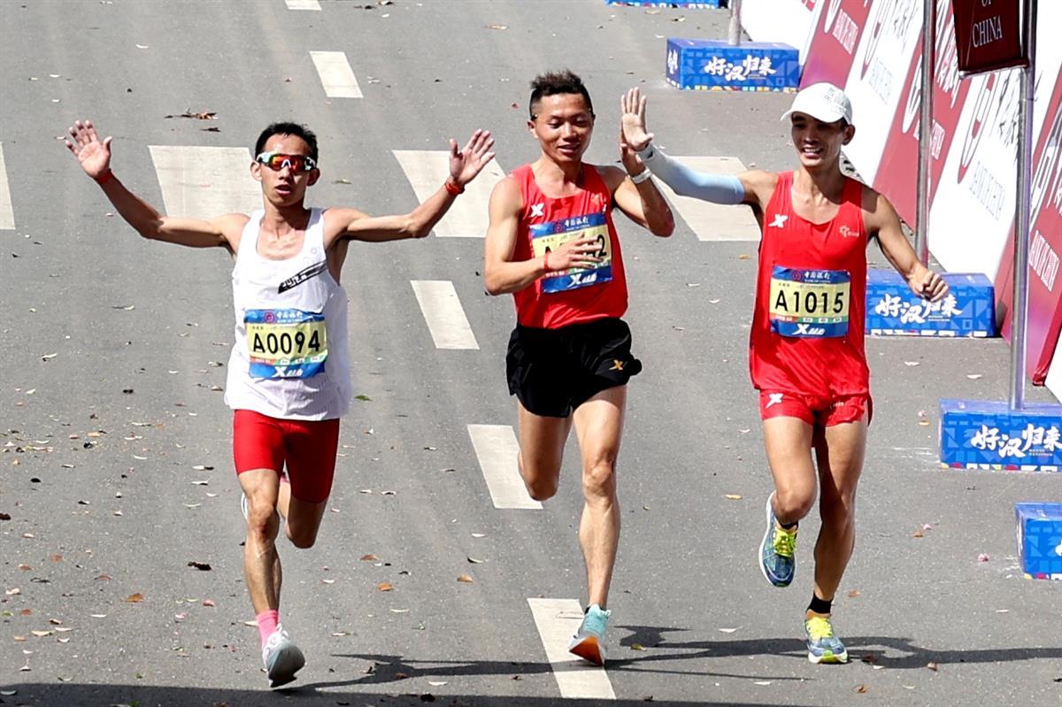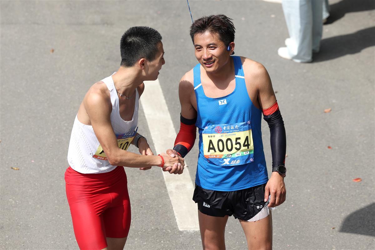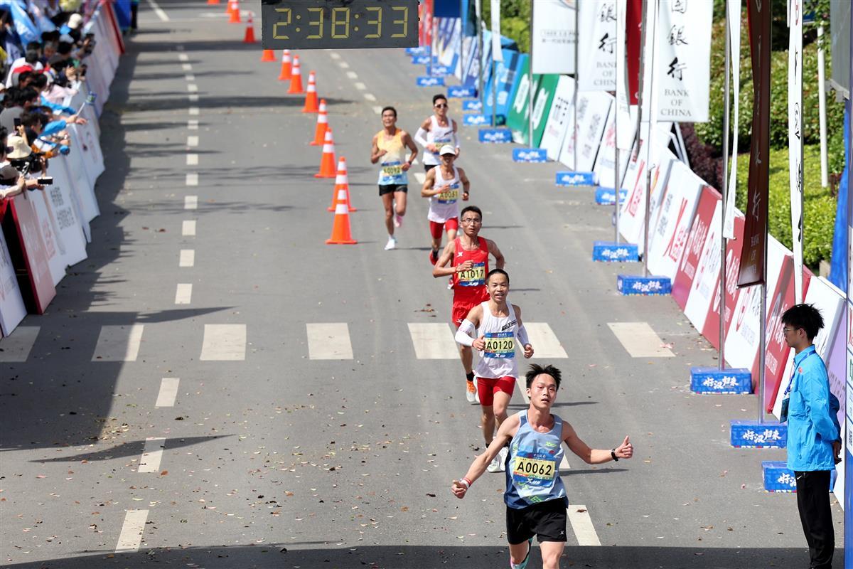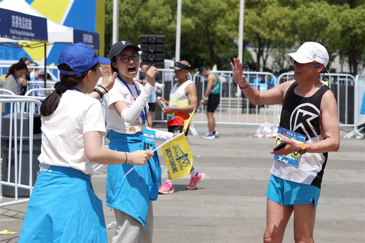 2023年4月16日,在武汉欢乐谷“汉马”终点现场,参赛选手挥舞手臂冲过终点,圆满完成比赛。2023武汉马拉松鸣枪起跑,26000人参加了全马、半马、13公里跑等项目的争夺。(湖北日报全媒记者倪娜摄)
