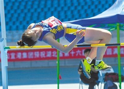 4月16日,省运会14—15岁组女子四项全能比赛,参赛选手比拼跳高。