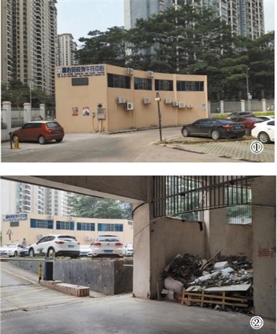 广西南宁市英华路9号东盟世纪村小区垃圾房,被开发商擅自改变用途,当成房屋用于出租(图①)。小区清扫的垃圾堆放在车库内(图②),造成环境脏乱差,滋生老鼠、苍蝇、蚊子等,严重影响居民生活。