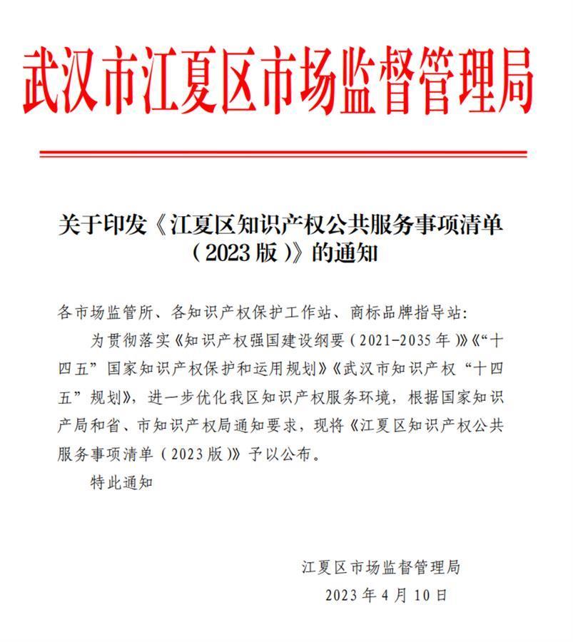 湖北日报讯(通讯员朱劲松)为推动知识产权公共服务标准化、规范化建设,切实提升社会公众和市场主体的获得感和满意度,近日,江夏区市场监管局(知识产权局)梳理印发了《江夏区知识产权公共服务事项清单(2023版)》(以下简称《清单》),首次统一向社会公开发布,为各类创新主体提供标准化、规范化的知识产权公共服务内容,推动提高知识产权公共服务质量和服务水平。