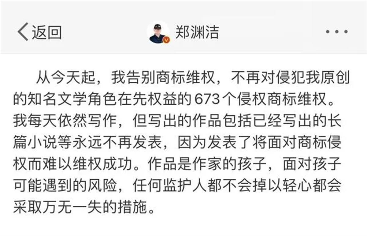 今天,“童话大王”郑渊洁发布微博称,他将告别商标维权,不再对侵犯其原创的知名文学角色在先权益的673个侵权商标维权。同时他表示,自己每天依然写作,但“写出的作品包括已经写出的长篇小说等永远不再发表,因为发表了将面对商标侵权而难以维权成功”。(红星新闻)