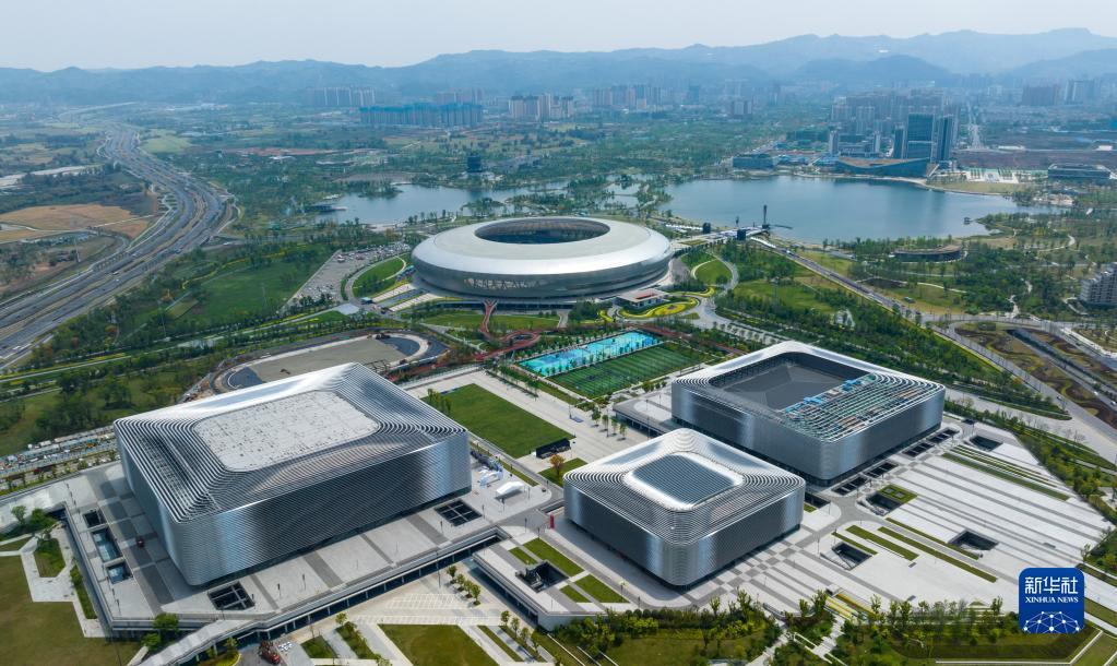 这是2023年4月18日拍摄的东安湖体育公园主体育场(后)、多功能体育馆(前左)、游泳跳水馆(前右)和小球馆(前中)。新华社记者 沈伯韩 摄