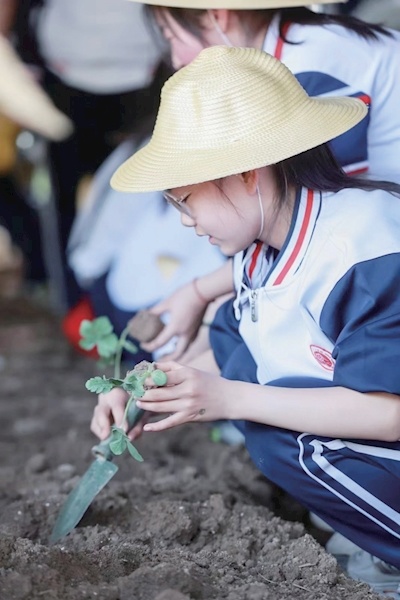 学生们在地里栽苗体验农活。图/通讯员王雪峰