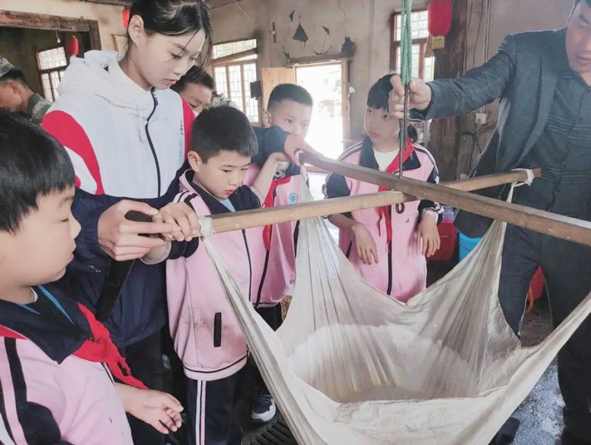 学生们体验豆腐的制作过程。图/通讯员程霞