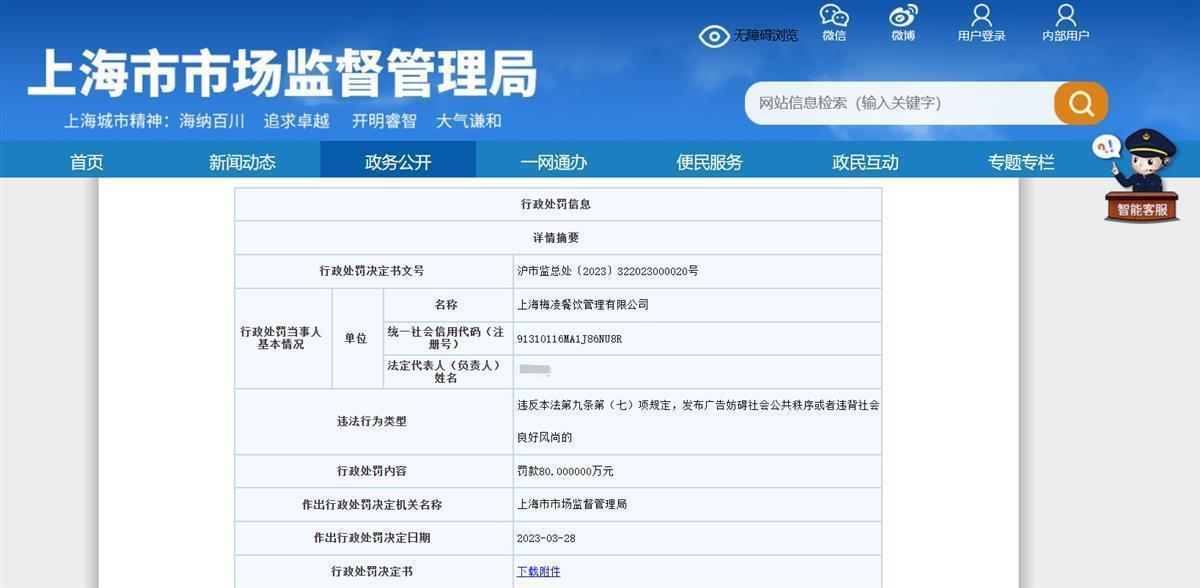 涉事商家被罚80万元 图片来源:上海市市场监督管理局官网