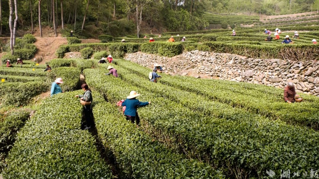 湖北日报客户端讯(通讯员 杨欢)眼下正是春茶采摘的好时节,十堰市郧阳区白桑关镇高源村以独特的地理优势,大力发展茶文化,以茶为媒,茶旅结合,全力打造“茶旅康养休闲示范村”。日前,在高源村茶园,采茶工正抢抓好天气采摘春茶,翻手间,茶树尖上冒出的点点新绿便轻快地飞入竹筐中,丰收的喜悦洋溢在她们的脸上。