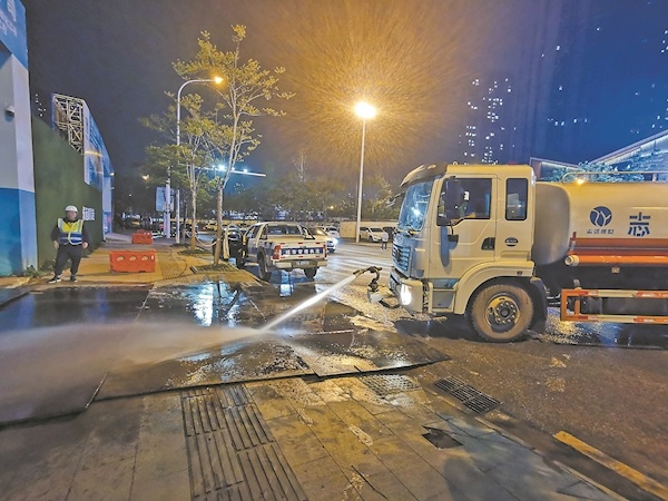 很快,两台渣土洗完“澡”,然后缓缓开向工地大门。就在出门的钢板上,一辆渣土车墙板与篷布之间,突然掉落一小块泥巴。保洁员很快发现,当即铲除泥巴。在工地大门外的洒水车司机蔡金汉,启动水车车头前的水炮,一阵喷射,污水顿时流进了工地的排水沟中,“我们不能让车辆拖泥带水上路。”