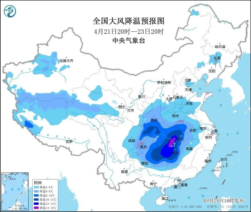 中央气象台21日18时继续发布大风降温预报,21日夜间至23日,西北地区东南部、黄淮西南部、江淮西部、江汉、江南西部、西南地区东部等地气温将下降4~8℃,湖北南部、湖南中部和北部等地部分地区降温幅度可达10~12℃,局地降温幅度超过14℃。