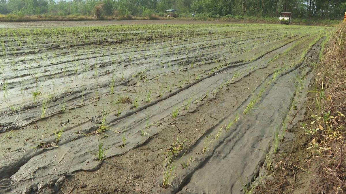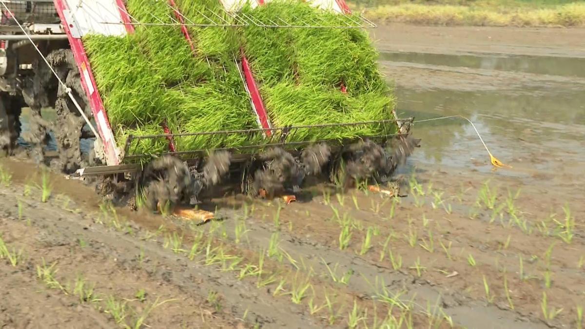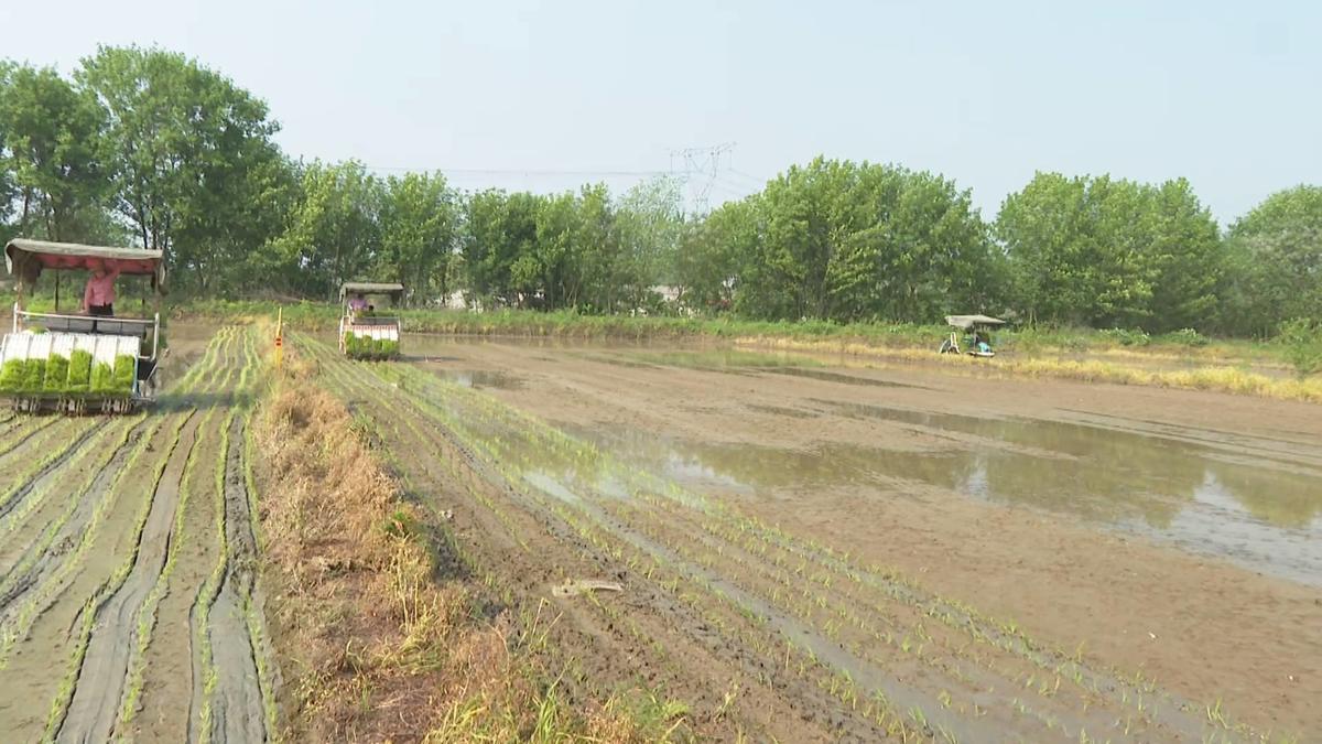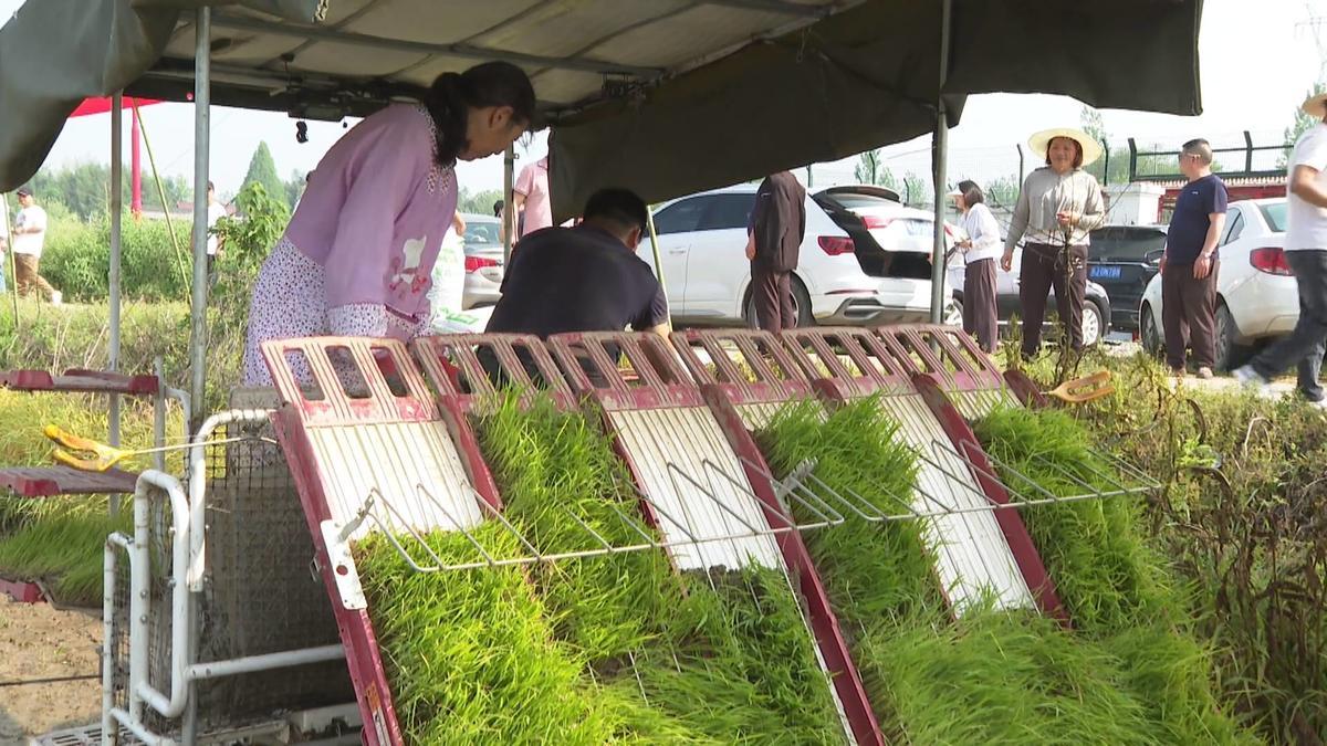 农机手张锐说:“我们这个机器一天可以插40亩左右,几台机子一起插的话,这个示范片一天就可以插完。”